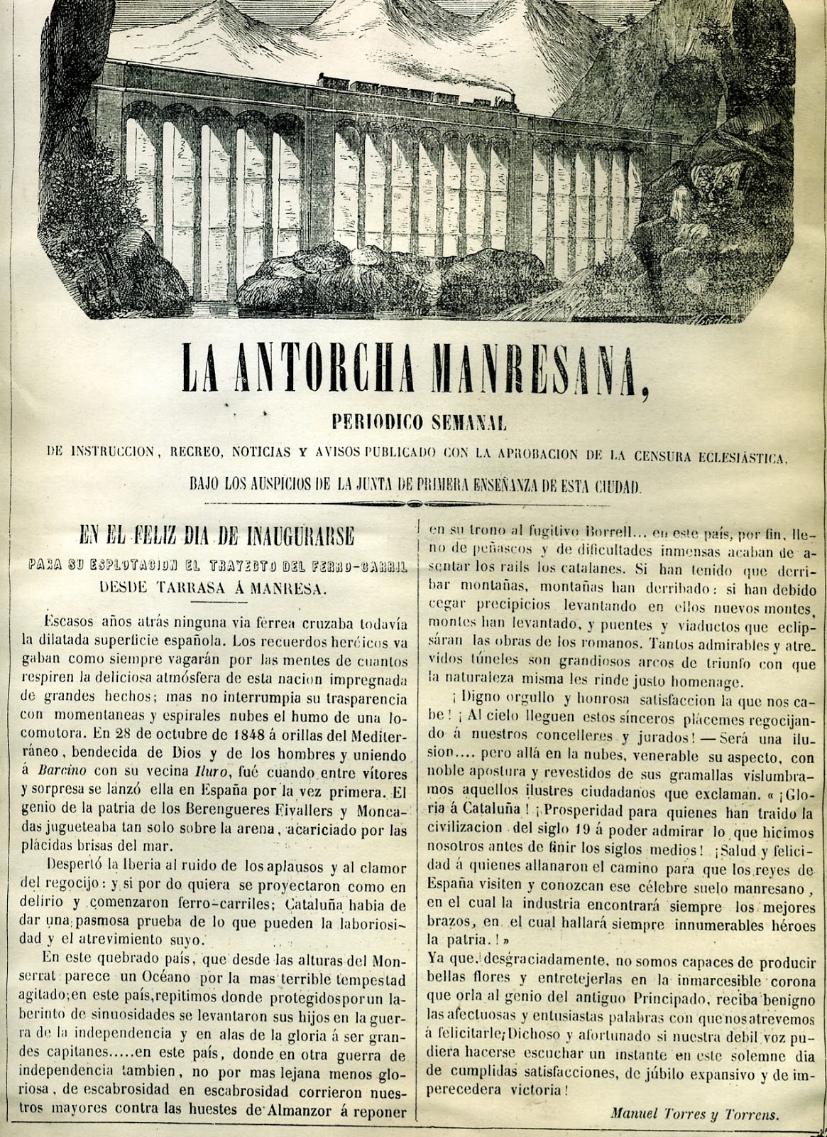 Tras el éxito del primer ferrocarril peninsular, inaugurado en 1848 entre Barcelona y Mataró, nuevas iniciativas comenzaron a tejer una densa red ferroviaria que pronto superaría el ámbito catalán para extenderse a las regiones limítrofes. El primer paso en este proceso fue la apertura de la línea de Terrassa a Manresa, abierto al servicio hace ahora 160 años, cuya vocación no era otra que alcanzar, primero Lleida y, a continuación, Zaragoza, donde a su vez se podría proseguir hasta Madrid. Por ello, este proyecto, el de mayor envergadura de la época, fue declarado como «línea general de primer orden».