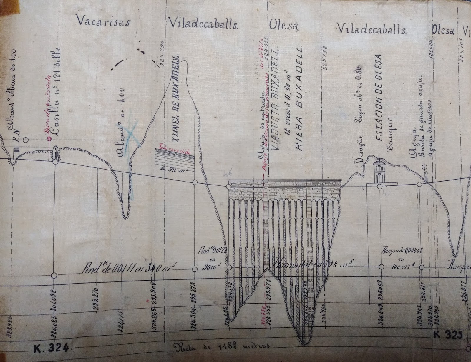 Plano original del tramo de la estación de Olesa donde está ubicado el viaducto del Boixadell. Archivo del Museo del Ferrocarril de Catalunya