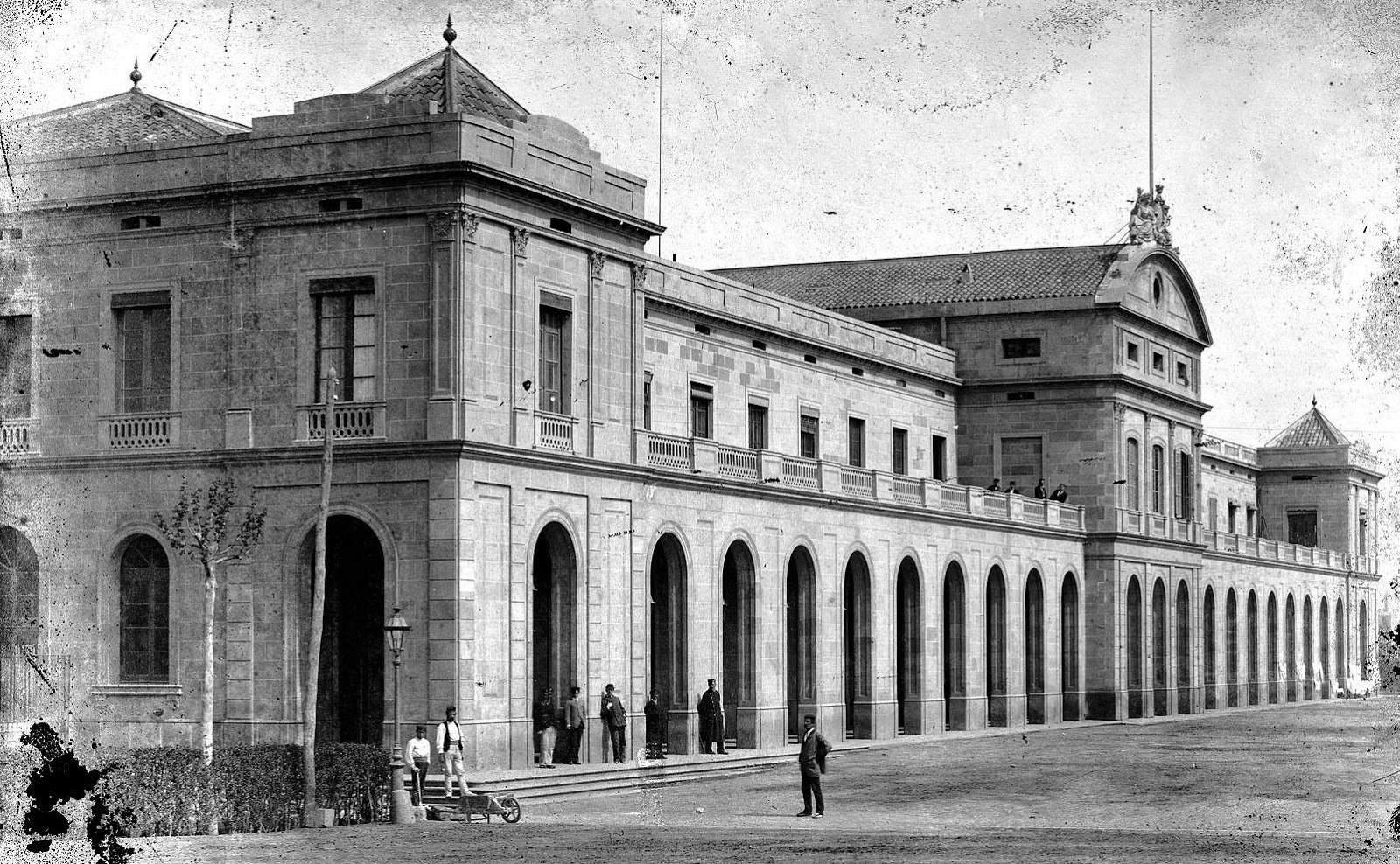 Fachada principal de la estación del ferrocarril de Barcelona a Zaragoza en la ciudad condal, el gran proyecto de José Manuel Planas Comte. Fotografía de Jean Laurent. Fototeca del Ministerio de Cultura