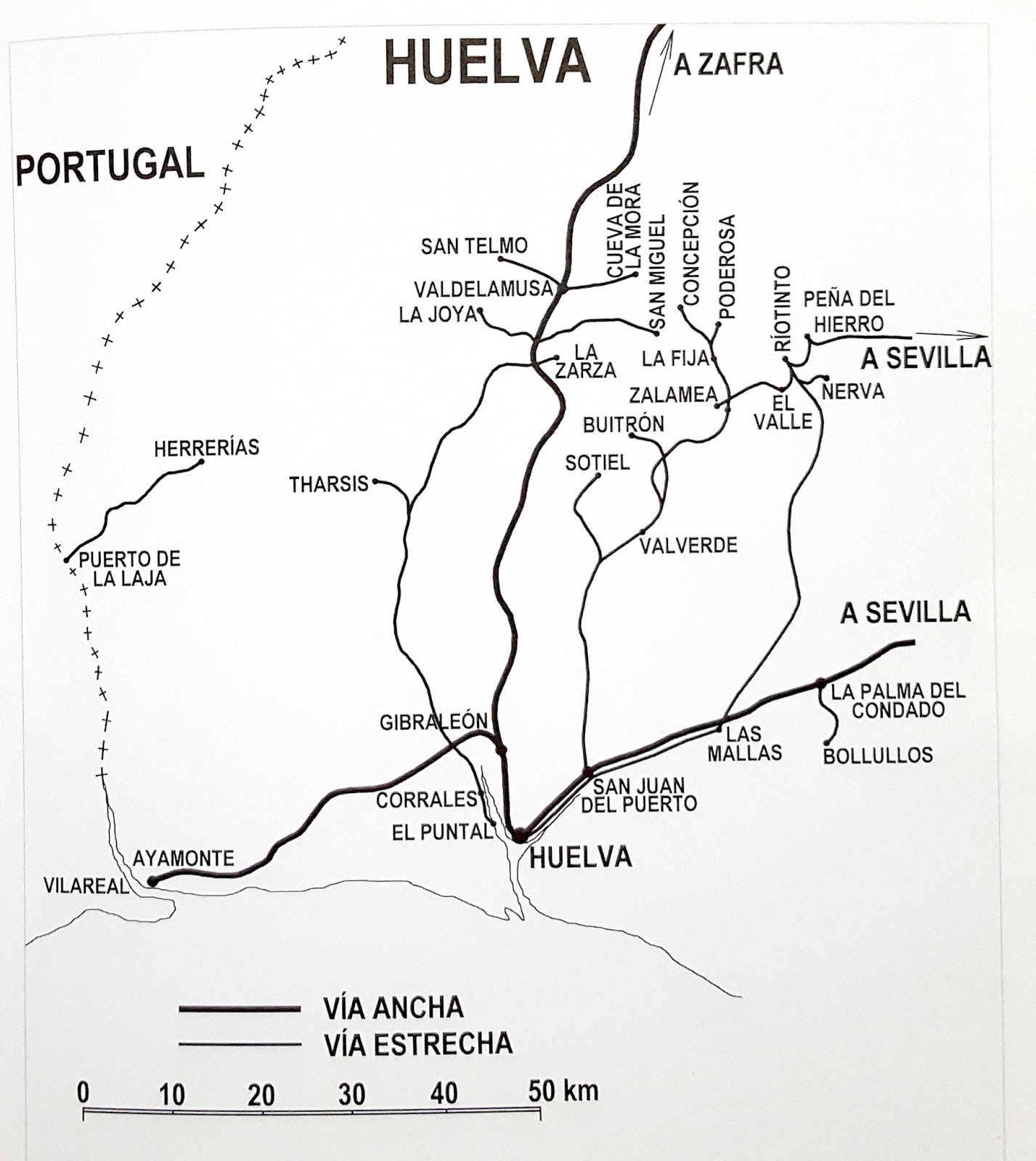 En entradas anteriores me he referido a tres importantes ferrocarriles de vía estrecha de la provincia de Huelva - Tharsis, Buitrón y Riotinto- en los que, además del transporte de mineral, que era su actividad principal, efectuaban también el de pasajeros. Pues bien, antes de abandonar esta provincia y dirigirnos a la de Sevilla, quiero dedicar esta entrada de hoy al recuerdo de un pequeño, casi diminuto, ferrocarril que en su corta vida de diez años, a principios del siglo XX, reflejó el interés y la apuesta de un pueblo andaluz por el progreso que entonces significaba el ferrocarril. Me refiero al llamado "Ferrocarril del Condado".