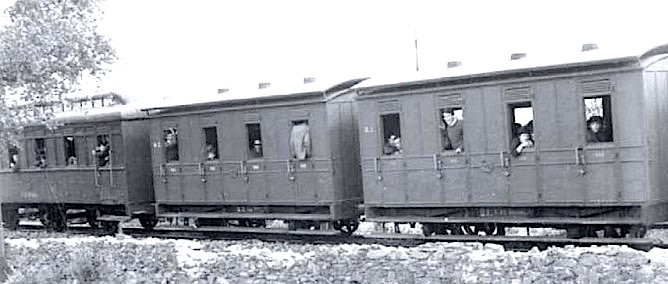 Algunos de los coches de viajeros del ferrocarril de Buitrón. El parque se componía de un coche salón, tres de primera clase, seis de tercera clase y ocho mixtos (Foto: fondo Copeiro del Villar)
