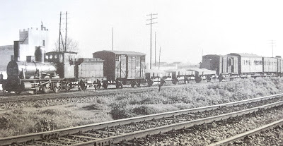 La 030-2513 (Andaluces 172) en Córdoba, en cabeza del ómnibus de Córdoba a Marchena en octubre de 1963. Sería desguazada al año siguiente. Obsérvese la curiosa composición con furgón, coche "yenka" y otro antiguo de madera y con estribo corrido. A su lado aparece "la modernidad" en forma de una eléctrica 7800 (Foto: L. G. Marshall) |