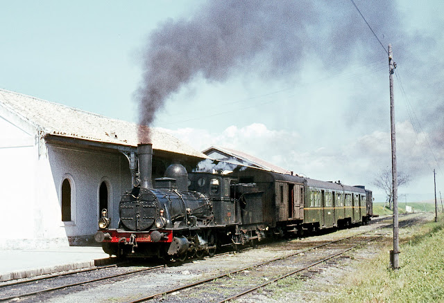 Una imagen entrañable con la 030-2516 (Andaluces 175) a la cabeza de una composición de dos coches "yenkas" más furgones de cabeza y cola. La foto está tomada en la estación de Guadalcazar, provincia de Córdoba, en abril de 1966 (Foto: Ian Tumbull) |