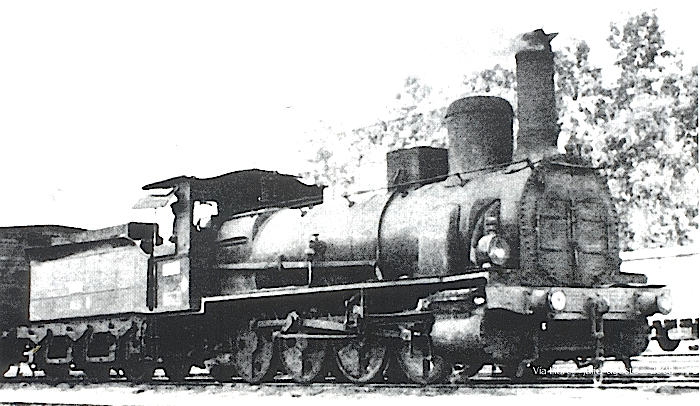 | La más antigua fotografía disponible de estas locomotoras es ésta del álbum de RENFE de 1947. Aparte de las ruedas macizas, destaca mucho la gran válvula situada encima del domo de vapor. |