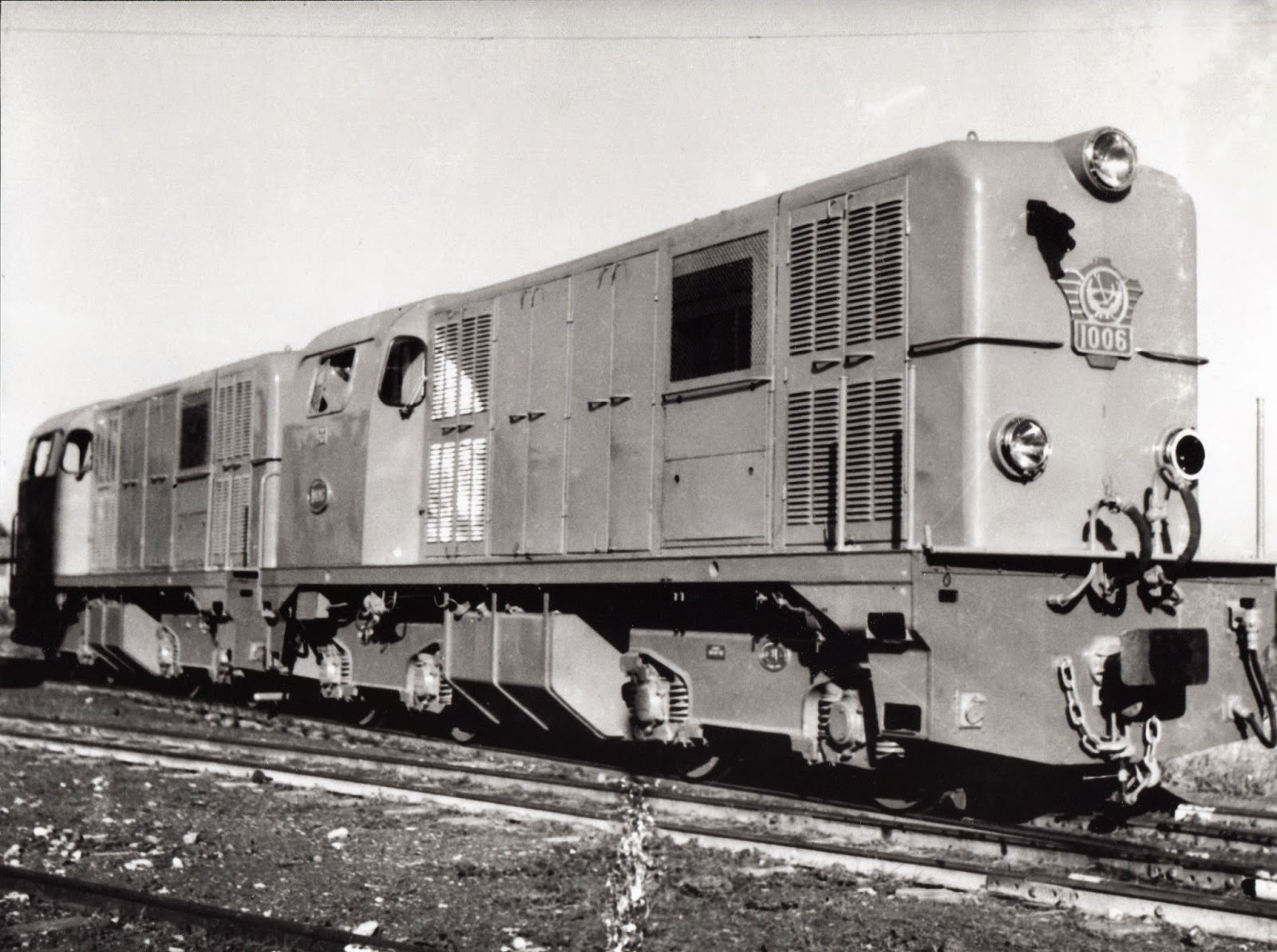 La 1006 junto con otra "mil" no identificada, en sus primeras pruebas con el anagrama del Ministerio de Obras Públicas (MOP) (Foto: autor desconocido/Museo Vasco del Ferrocarril) |
