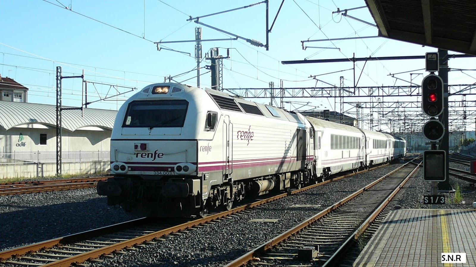 La 334-003 entra en Santiago de Compostela en cabeza de un tren Arco (foto: S.N.R.) |