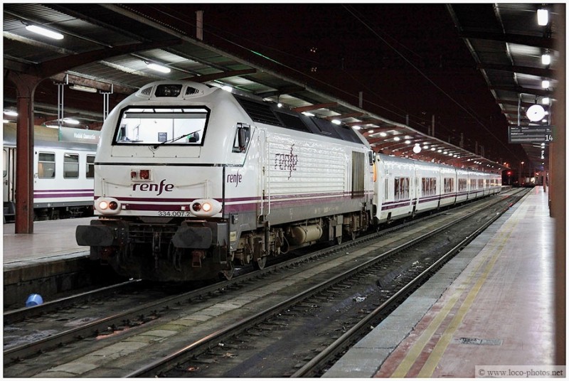 Por tanto,nuestras 334 nacieron como locomotoras de dos bogies, dos ejes cada uno, y con un motor diesel de doce cilindros con una potencia de 3400 CV. Si bien su ancho de vía era el normal español podían ser equipadas con bogies para el ancho europeo. Se recibieron entre 2006 y 2008 y efectuaron pruebas en la línea de Valencia a Teruel y también en el puerto de Pajares. Una vez operativas, en enero de 2007 se hicieron cargo de la tracción de los talgos Madrid-Murcia-Cartagena, pudiendo ya circular a 200 km/h en algunos tramos. Después -y aunque no existían en esos servicios tramos aptos para alcanzar los 200 km/h- remolcaron a los talgos de Madrid a Galicia y de Madrid a Extremadura sustituyendo a las veteranas y casi desaparecidas 354.