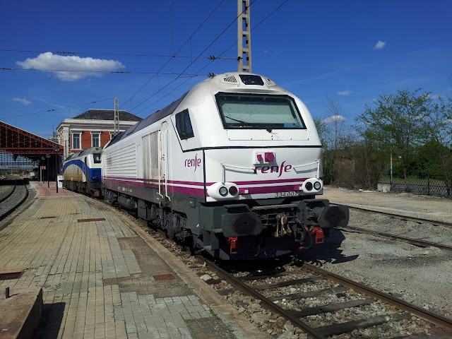 La 334-007 espera su servicio en Medina del Campo delante de una 333-400 (Foto: Ángel Rivera) |