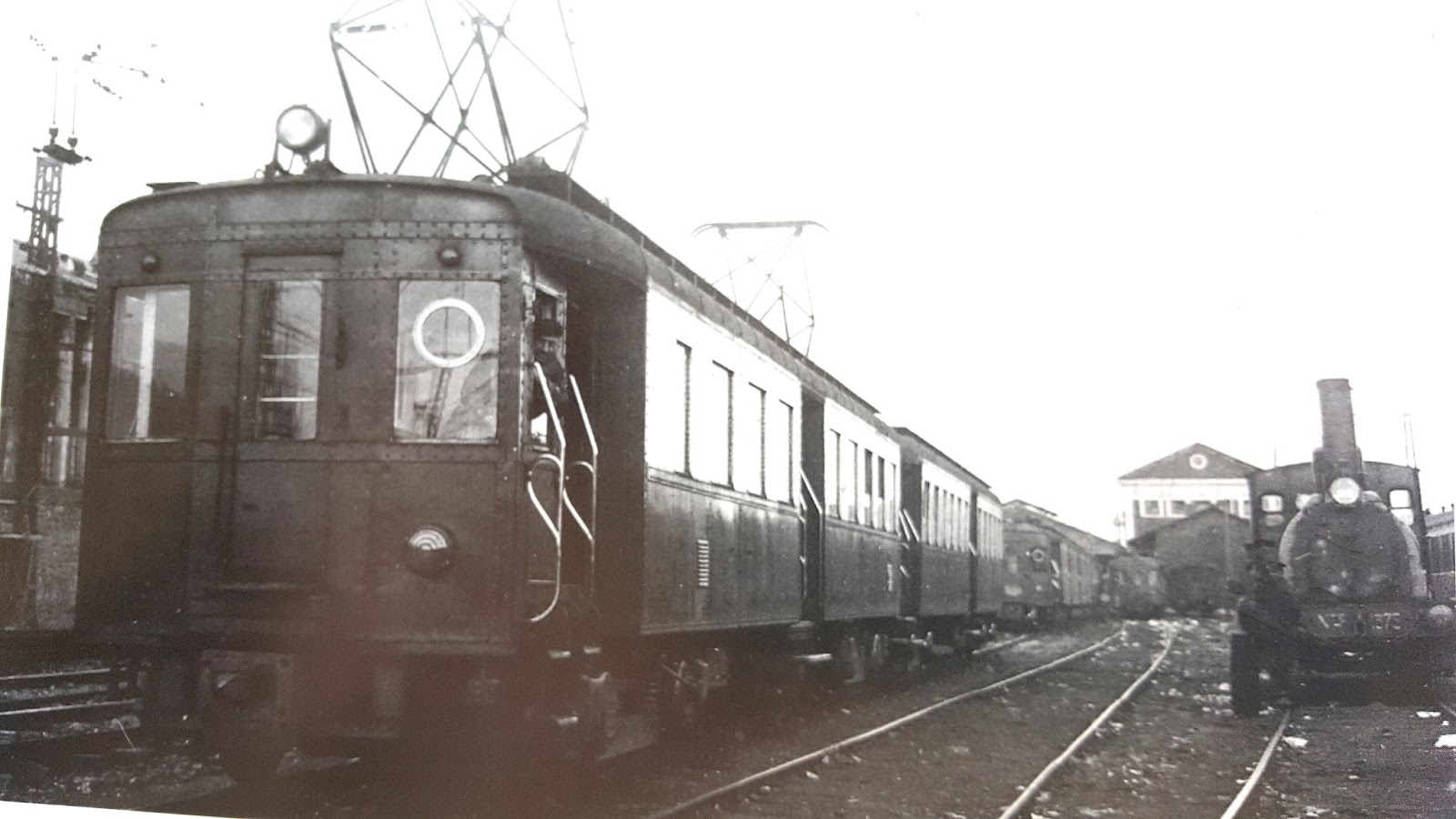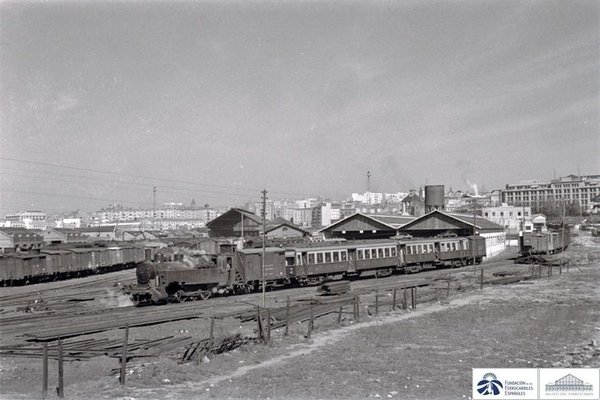 | En 1957, Wyrsch fotografió a esta "trescientas" junto a la estación de Delicias remolcada por una locomotora de vapor. ¿Qué hacía por allí? Lo único que se me ocurre pensar es que iba a pasar una revisión o reparación a los Talleres Generales de RENFE. |