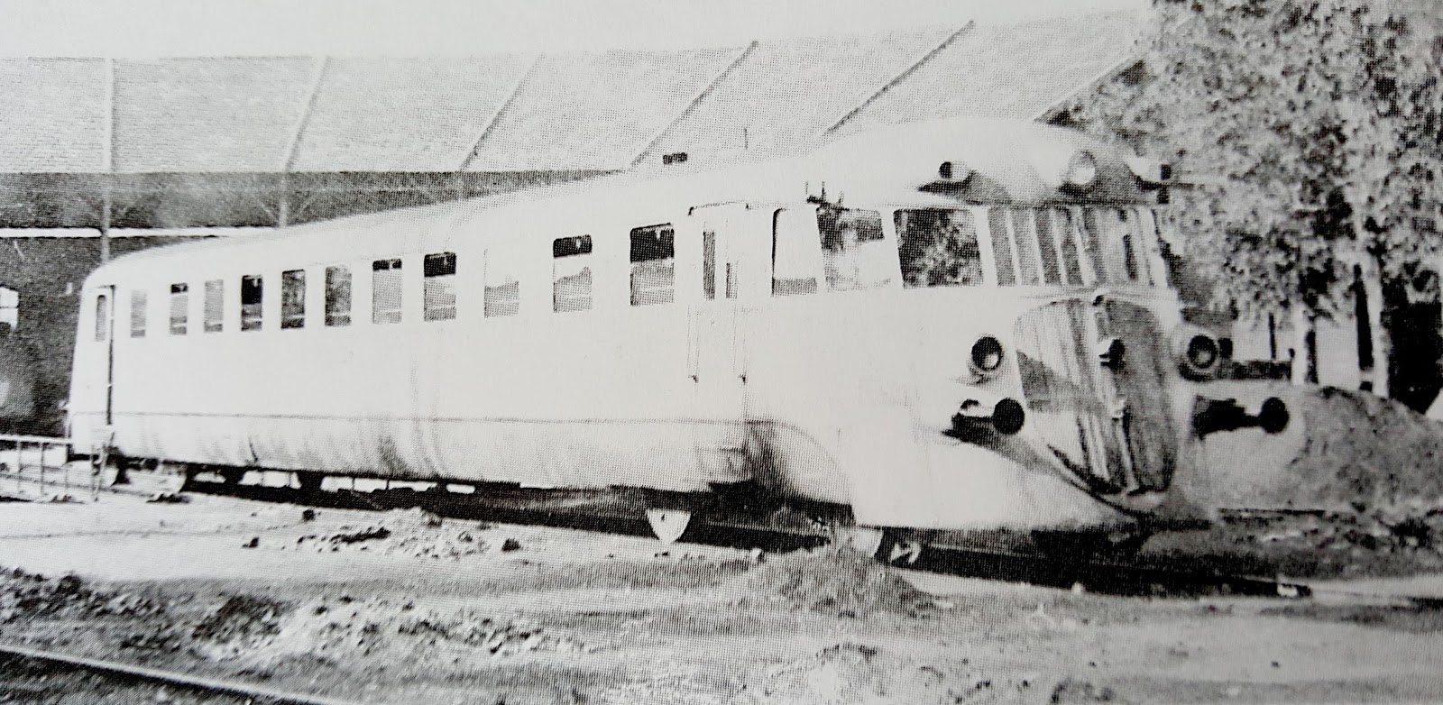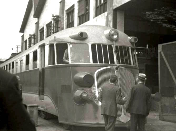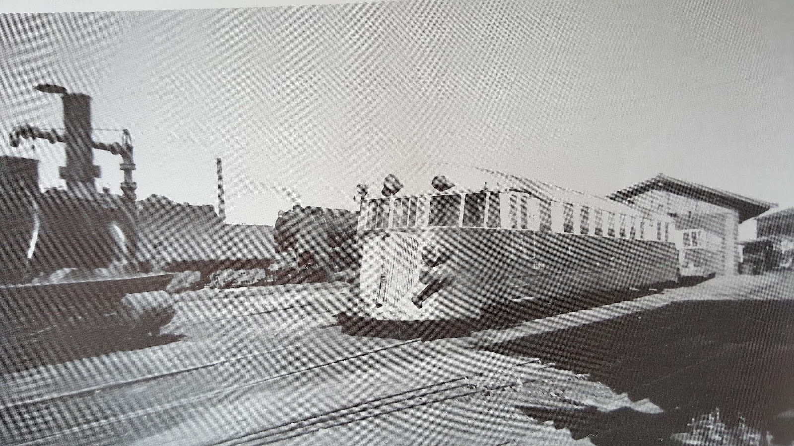 En el depósito de Cerro Negro, en Madrid, a finales de los 40. Detrás de la littorina, se adivina un Renault ABJ (Foto tomada del libro Automotores españoles, de Javier Aranguren)
