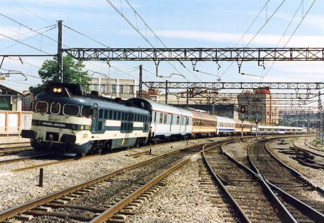 | La 354-007 encabeza un talgo a Cartagena ºcon una composición de refuerzo de coches convencionales. La imagen está tomada en 1995 en Villaverde Bajo (Foto: Pacheco/Forotrenes) |