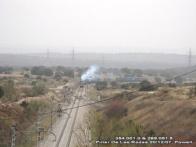 | Una imagen curiosa: la 354-008 hace un traslado de material Talgo III. Era el año 2006 y la imagen está tomada en Pinar de las Rozas (Foto: I. Martín) |