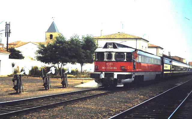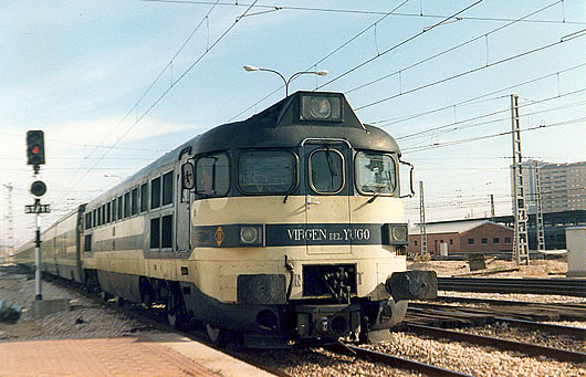 | La 353-001 Virgen de Lourdes pasa por Ciudad Real en julio del 88 con el talgo Conquistadores hacia Badajoz (Foto: Alejandro Tomás Pozuelo) |