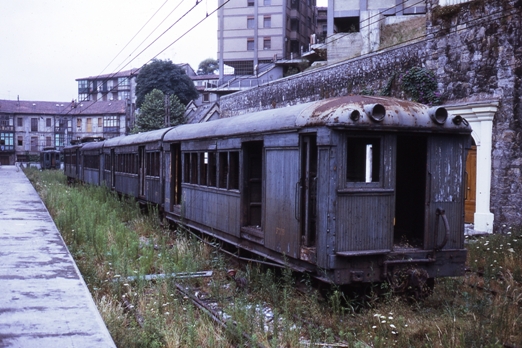 Un grave desprendimiento interrumpió el servicio ferroviario entre Bilbao-Calzadas y Ciudad Jardín entre 1969 y 1986. Tren abandonado en la primera de las estaciones. Fotografía de Jean-Henry Manara