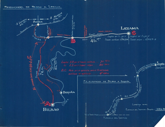 El proyecto aprobado por el gobierno suponía una transformación radical del primitivo ferrocarril de Lezama, del que únicamente se aprovecharían los 4.668 metros finales de su trazado, desde poco antes de llegar a la estación de Derio hasta la estación del barrio de La Cruz, a las afueras de Lezama. Los restantes 10,2 kilómetros quedarían al margen, al ser sustituidos por una variante de trazado de 7.167 metros que incluía la perforación de un nuevo túnel de 1.350 metros bajo el monte Artxanda, a una cota lo suficientemente baja, y que, unido a la construcción de otras tres galerías de 799, 134 y 72 metros de longitud, respectivamente, limitó las mayores rampas a tan solo 16,9 milésimas, notablemente más suaves que la brutal ascensión y el consiguiente descenso original. En consecuencia, el 65% de los 11.834 metros a los que quedaría reducida la línea serían de nueva construcción.