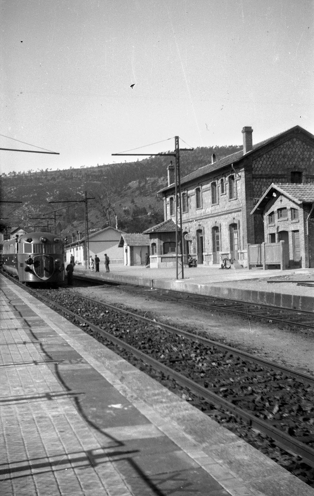 | Una littorina del segundo grupo en la estación de El Chorro en 1954. Curioso el diseño frontal de la librea, todavía en rojo y crema típico de MZA (AHF/MFM. Autor: Vicente Garrido) |