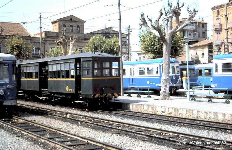 En agosto de 1983 viajé a Valencia para conocer algunos de los vehículos que servían las líneas de la antigua Compañía de Tranvías y Ferrocarriles de Valencia (CTFV), y que desde 1965 operaban ya bajo la empresa estatal FEVE. Sabía que existían dos estaciones de vía estrecha, la de Pont de Fusta, de la que salían las líneas hacia el norte de la ciudad con destinos al Grao, Bétera, Rafelbuñol y Lliria, y la de Jesús, cabecera de la línea que, a través de la comarca de La Ribera, se dirigía hacia Vilanova de Castelló. También salía de ella un pequeño ramal hacia el cercano barrio pesquero de Nazaret, ramal que había sido muy dañado por las inundaciones de 1957 y ya definitivamente clausurado.