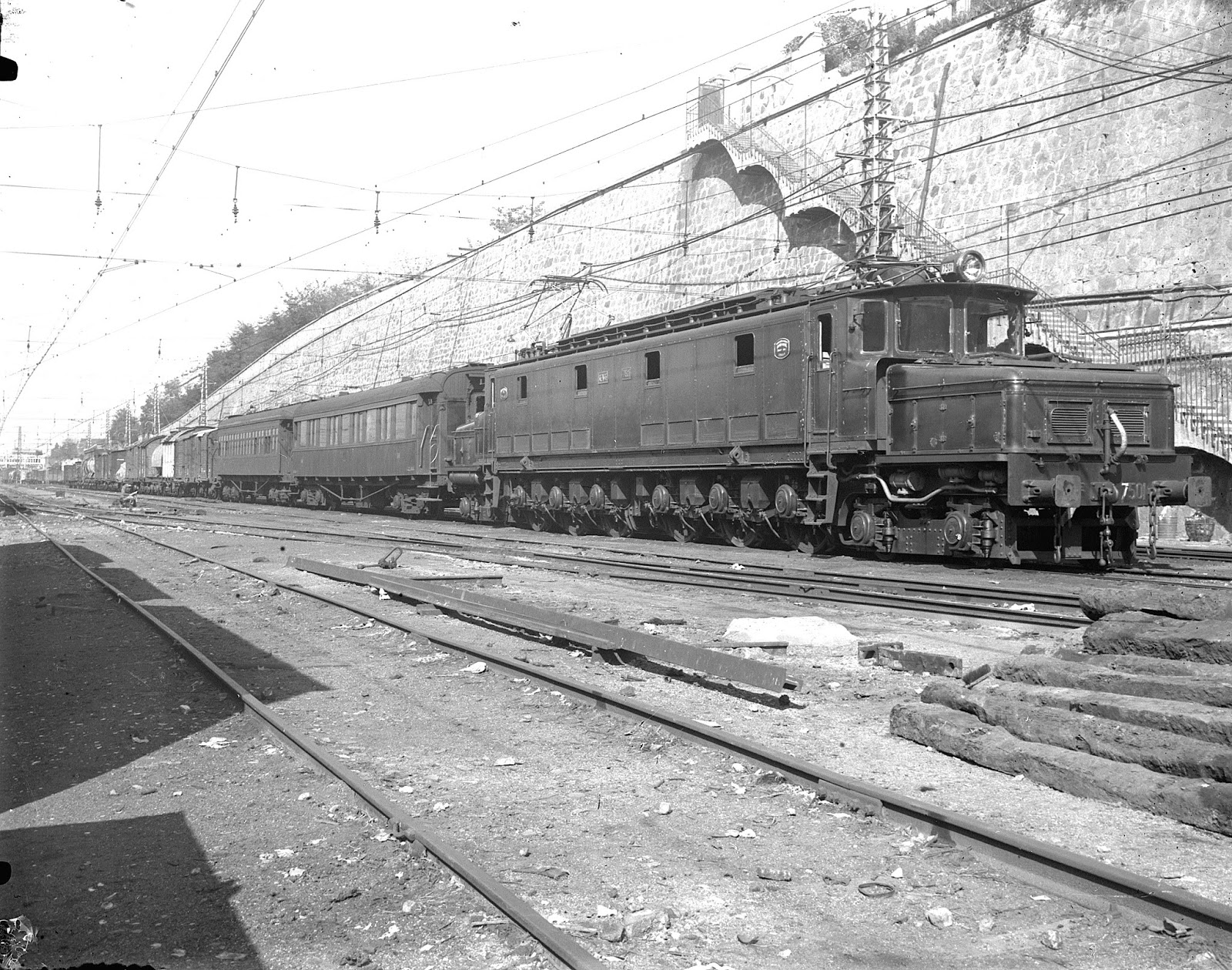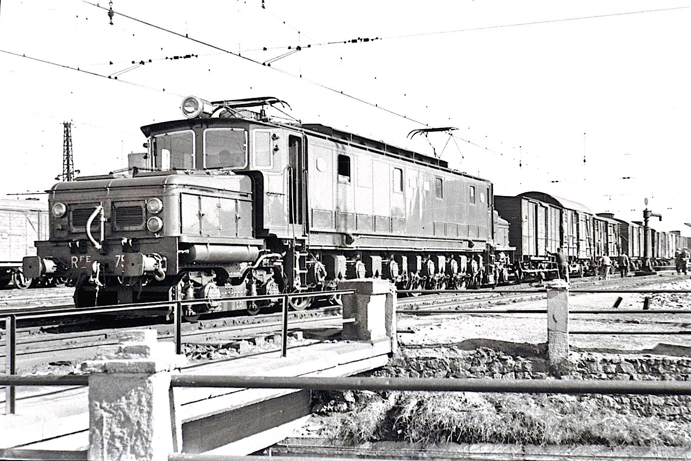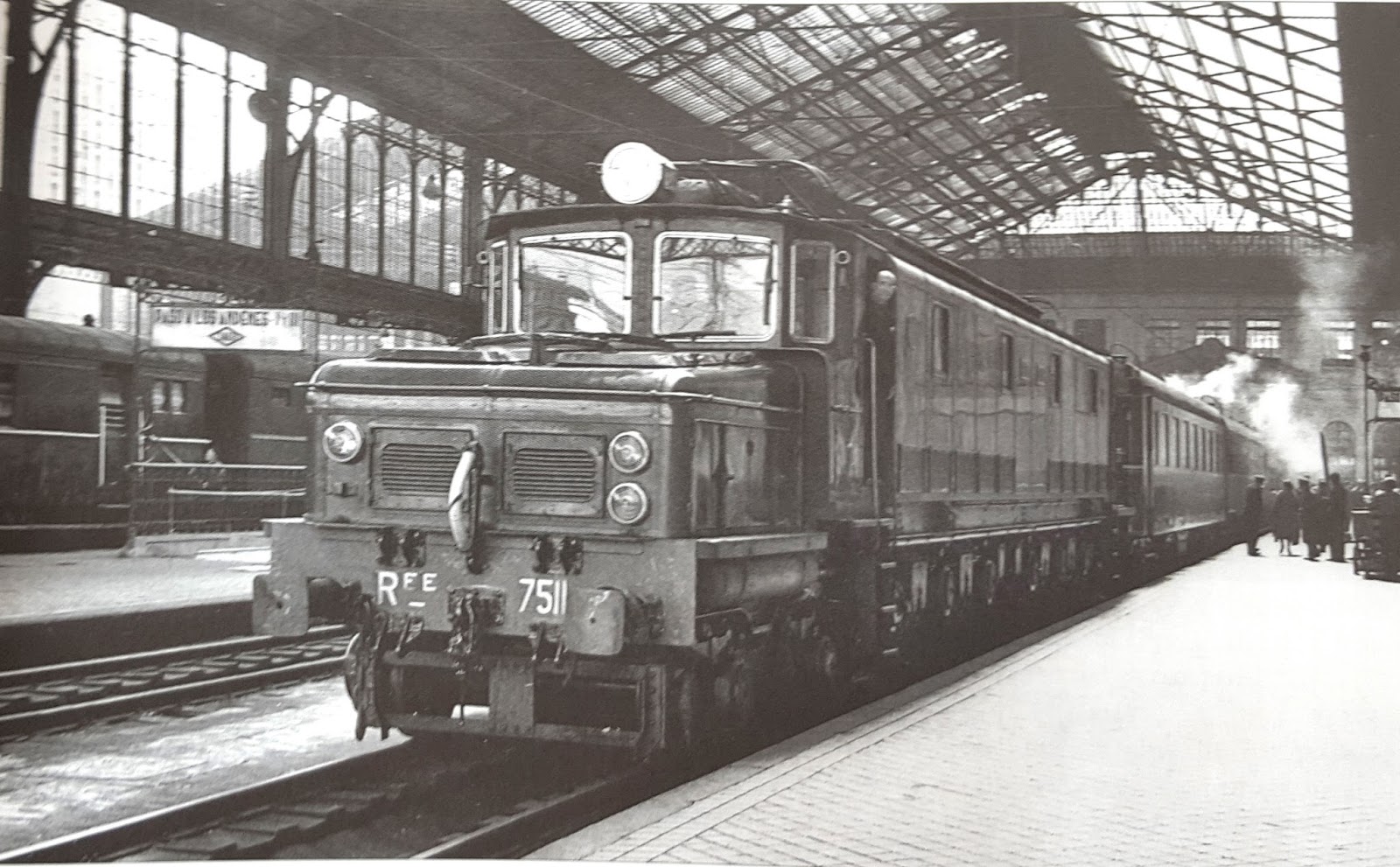 | La 7511 en la estación de Príncipe Pío de Madrid en cabeza de un tren hacia el norte. Era el año 1950 (foto: Juan B. Cabrera/ a través del Museo Vasco del Ferrocarril) |