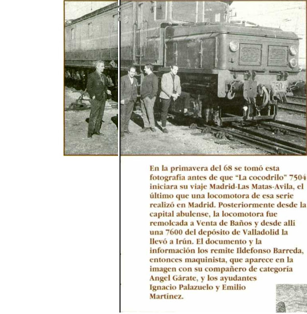 Estas palabras que casi son una declaración de amor de un maquinista a su locomotora, pertenecen a un artículo que escribió Carlos Moviñas, maquinista de la 7503 y apareció hace muchos años en el suplemento de Vía Libre que llevaba por título Por toda la red. Era un largo comentario al famoso artículo de Manolo Maristany "Cocodrilos, pingüinos y bañeras " que se recoge en su libro Viajes y Reportajes. Lo cierto es que las "sietemilquinientas", que durante un tiempo fueron las locomotoras más potentes de RENFE, enamoraron a muchos de sus maquinistas y despertaron la afición al tren de cientos de madrileños cuando las veían pasar por el paso a nivel de San Antonio de la Florida, muy cerca de la estación de Príncipe Pío, en Madrid. A tal efecto, no me resisto a copiar a continuación este hermoso párrafo de Fernando Fernández Sanz, publicado también en Vía Libre: