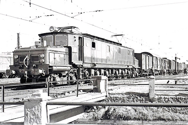 Las 12 locomotoras de la serie 7500 fueron construidas entre 1944 (7501 y 7502) y 1945 (7503 a 7512) por la Compañía Auxiliar de Ferrocarriles (CAF) a raíz de un pedido efectuado por la casi recién creada RENFE. El proyecto original provenía de la Compañía del Norte que, tras el éxito de las 7200 en sus líneas electrificadas del País Vasco, buscaba otra serie de locomotoras de características parecidas y también trabajando a 1500 V para la prevista electrificación de los servicios entre Madrid, Ávila y Segovia a través de la Sierra de Guadarrama, con fuertes pendientes. A esa demanda se adelantó en su momento la Sociedad Española de Construcción Naval (SECN) con el prototipo que fue la 7301, de la que ya me ocupé en una entrada anterior. Sin embargo, su complejidad en la parte eléctrica y los problemas de conducción que presentaba, junto con el advenimiento de la Guerra Civil, hizo que no se siguiera con esa solución y se optara por otra que, en el fondo, no era sino la de contar con unas 7200 más "jóvenes" y algo más potentes.