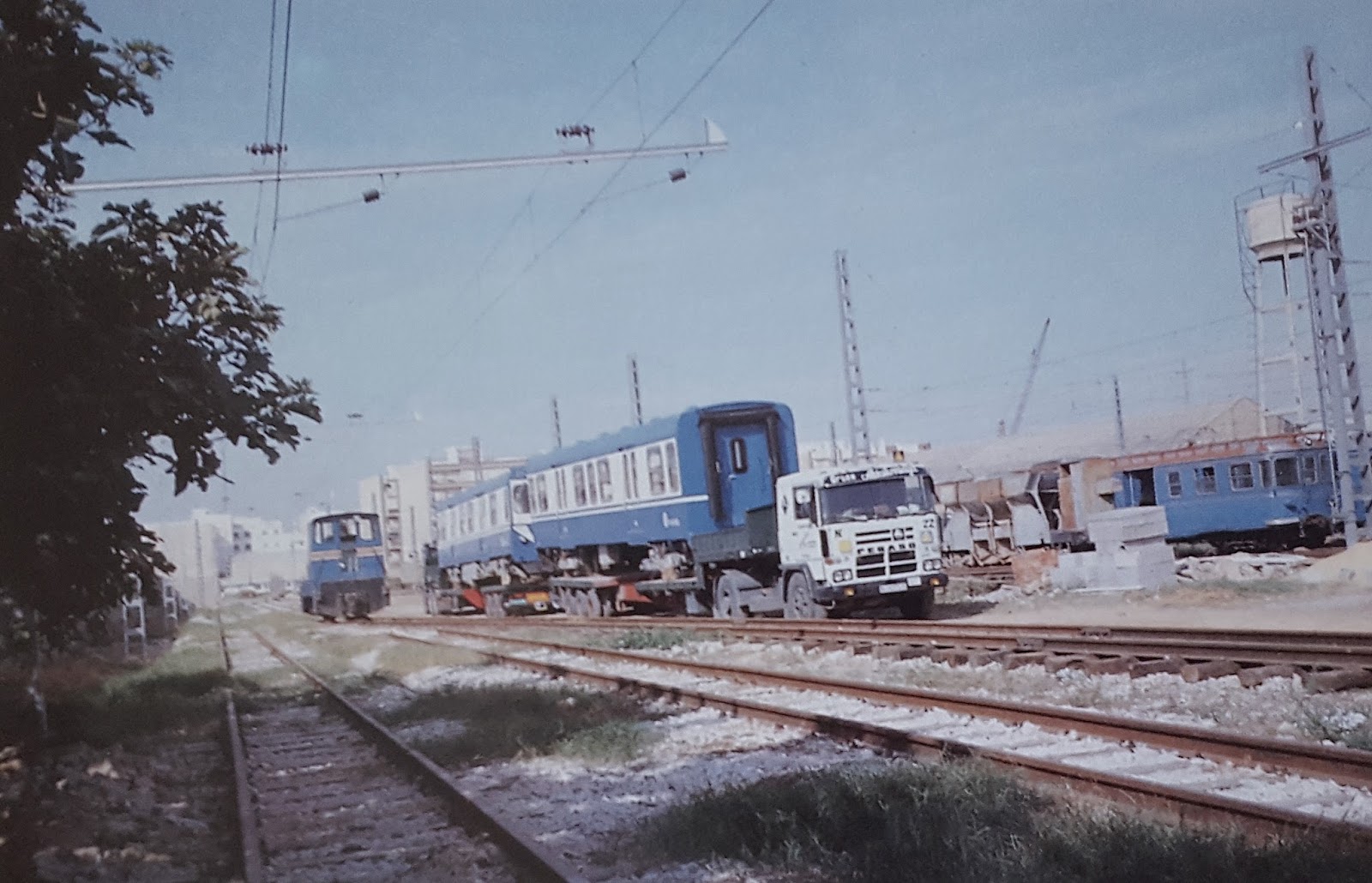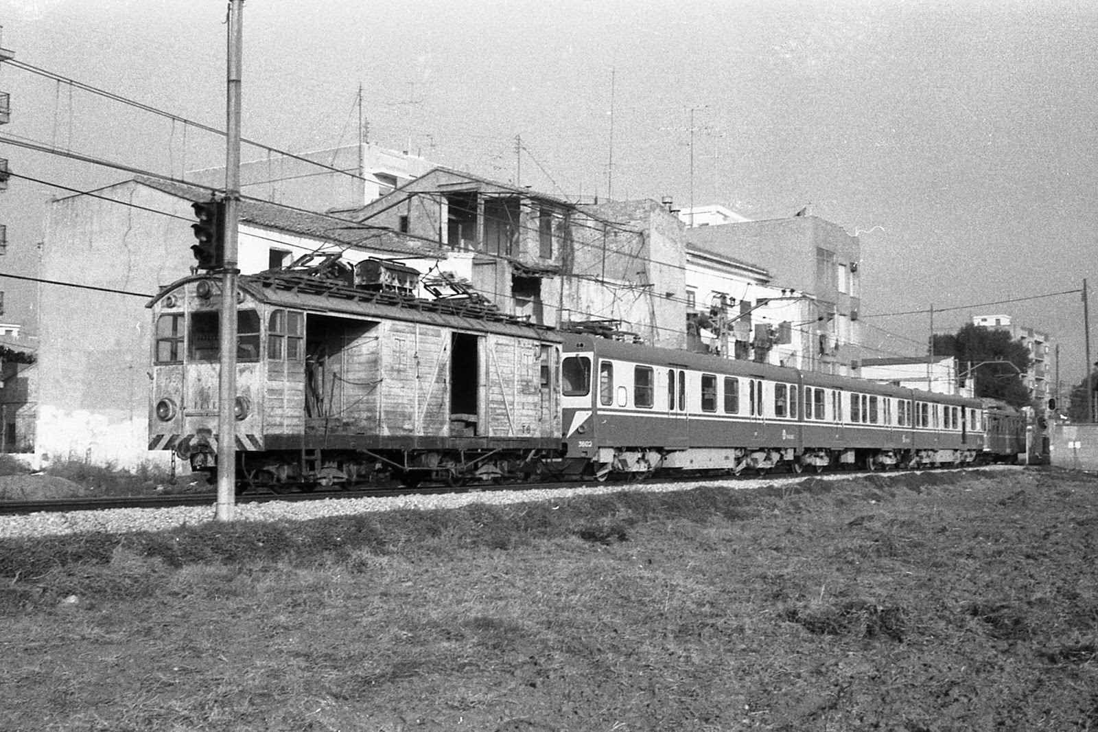 | Una 3600 en pruebas en las cercanías de Valencia arrastrada por un antiguo tractor-furgón mientras que al otro extremo parece observarse un automotor Billard (foto: Trevor Rowe/Archivo Museo Vasco del Ferrocarril) |