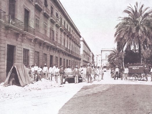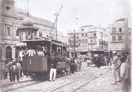 Inauguración de los tranvías eléctricos de Sevilla en la plaza de la Constitución. Archivo Euskotren/Museo Vasco del Ferrocarril