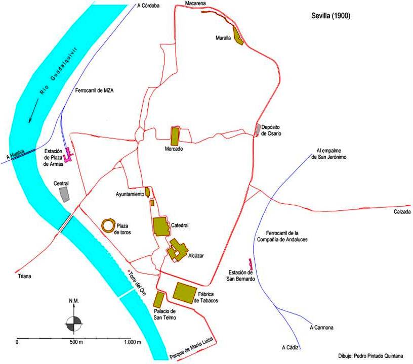 La primera red de tranvías sevillanos estaba formada por un conjunto de cuatro líneas que comunicaban la Plaza de la Constitución (actual plaza San Francisco), con la Macarena, la Puerta del Osario, la Calzada y Triana, a las que se sumaban servicios discrecionales a la plaza de toros y a la Puerta de Jerez. El ancho de la vía era de un metro entre las caras internas de los carriles y sobre ellos circulaban 41 coches, 20 cerrados y 21 jardineras abiertas, muy apropiadas para el cálido clima de la ciudad, construidos en Gran Bretaña por firmas como Bristol o Falcon.