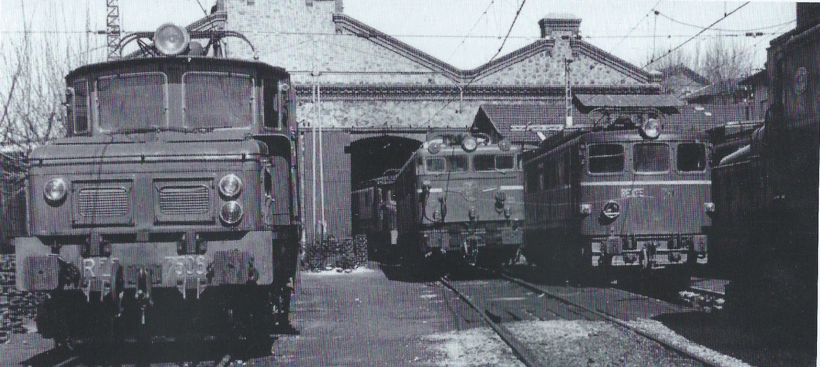 | Otras dos 7400 en el exterior de los mismos talleres. A la izquierda una fila de locomotoras de vapor tipo 1800 para los Ferrocarriles portugueses. (foto: colección Chema Martinez) |