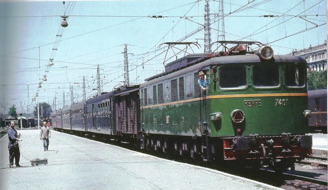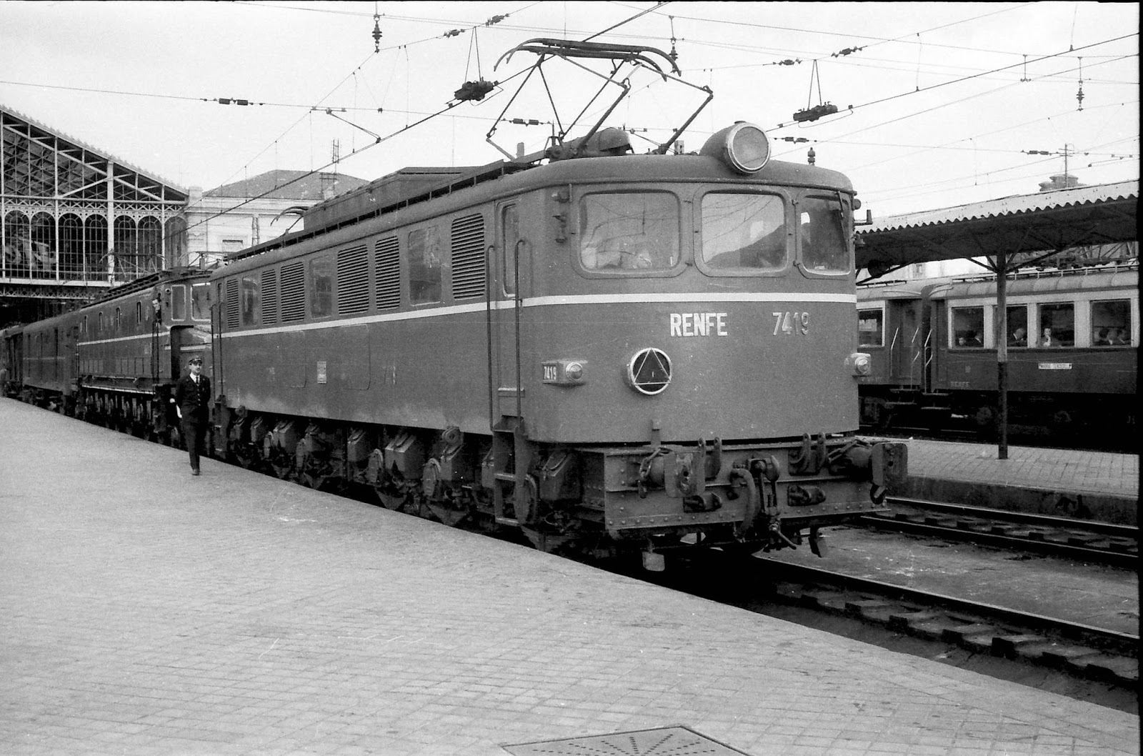 | Nuevas compañías para las veteranas eléctricas. Una 2000T, prácticamente a estrenar -era el año 1966- posa junto a una 7400. A la derecha de ambas una 300, en su andén habitual y a la izquierda una composición de un expreso nocturno preparado para salir más tarde hacia el norte (foto: AHF/MFM fondo Juan B. Cabrera) La 7401 entra en Príncipe Pío en julio de 1969 en cabeza de un ómnibus de Ávila o Segovia (foto: Trenmanía)