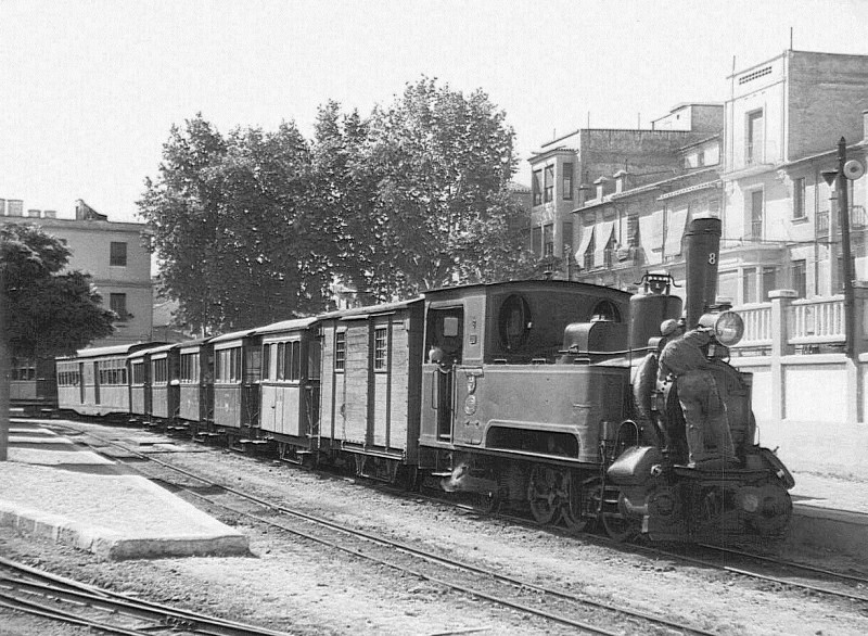 | La nº 8 encabeza un tren en la estación de Villarreal en 1960. Aunque se ve con dificultad, puede apreciarse como el cilindro derecho de la locomotora tiene menor diámetro que el izquierdo. Ello se debe a que al ser compound de dos cilindros, el de alta presión tiene un diámetro menor que el de baja. Se trataba de un diseño muy primitivo y complejo que en seguida se abandonó por el de cuatro ciliindros. Estas cuatro locomotoras parece que fueron las primeras de serie en llevar este sistema en España y debieron ser también unas de las más pequeñas compound construidas (foto: Javier Aranguren) |