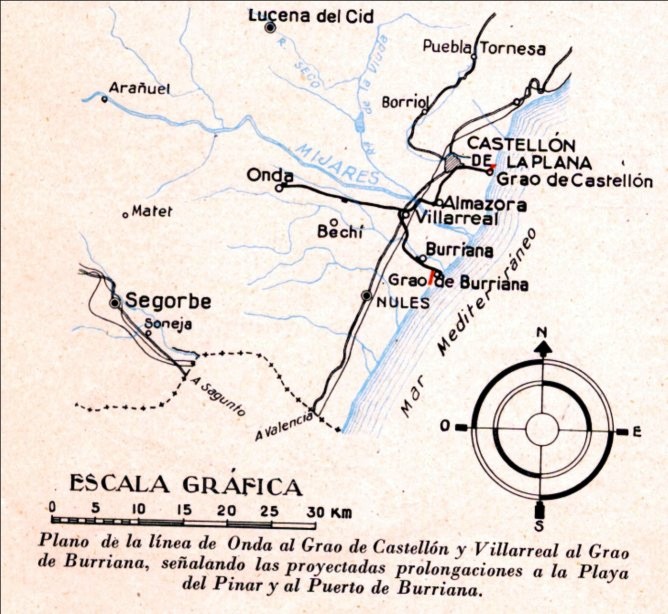 "Esta pequeña línea, conocida también localmente como La Panderola (especie de cucaracha), se distingue por muchas cosas, una de ellas por su paso a través de las calles de Castellón media docena de veces al día en cada dirección, de manera que si uno se sienta una ociosa mañana en un café de la plaza de la Paz, la más importante de la ciudad, pasarán literalmente por delante de su mesa el tráfico ferroviario y todo un conjunto de temas fotográficos sin rival"