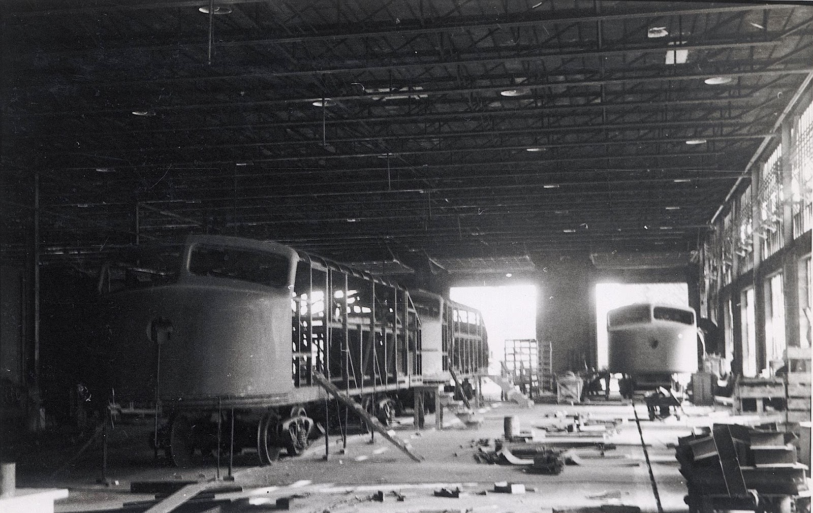 | Tres locomotoras Talgo en pleno proceso de construcción en Pennsylvania (Archivo Histórico Ferroviario del Museo del Ferrocarril de Madrid, Colección de Patentes Talgo) |