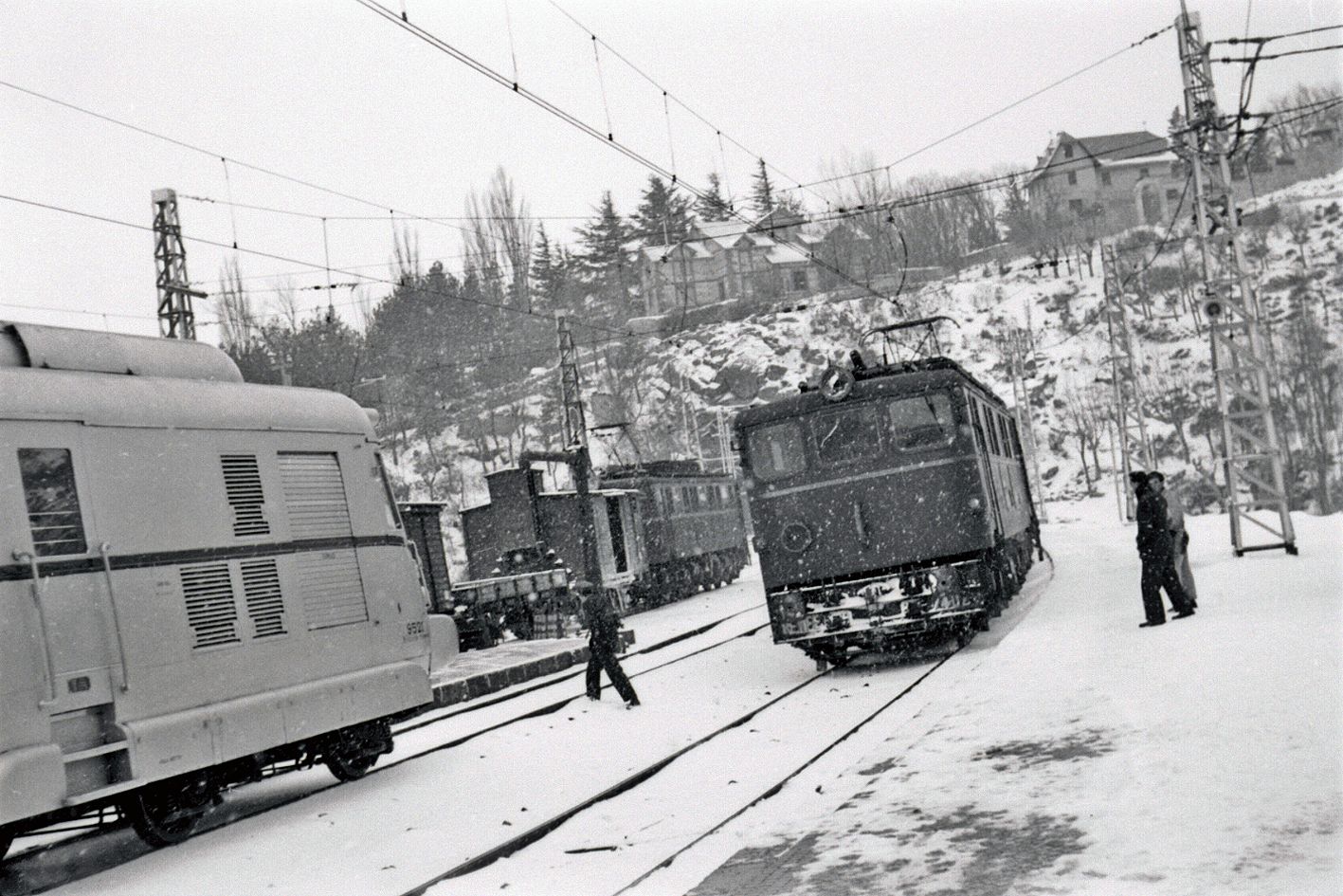 | Un TAF en ruta hacia el norte fotografiado por Karl Wyrsch en la estación de Cercedilla el 5 de enero de 1953. Además del paisaje nevado destaca el "imperio" de las 7400 (AHF/MFM) |