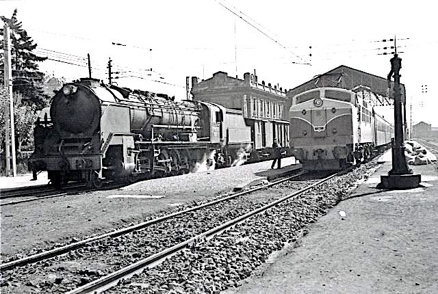 | En la estación de León, una recién estrenada 7800, en cabeza de un tren de viajeros, posa junto a otro mito, una 151 Santafé. Era octubre de 1955 (AHF/MFM. Foto: K. Wirsch) |