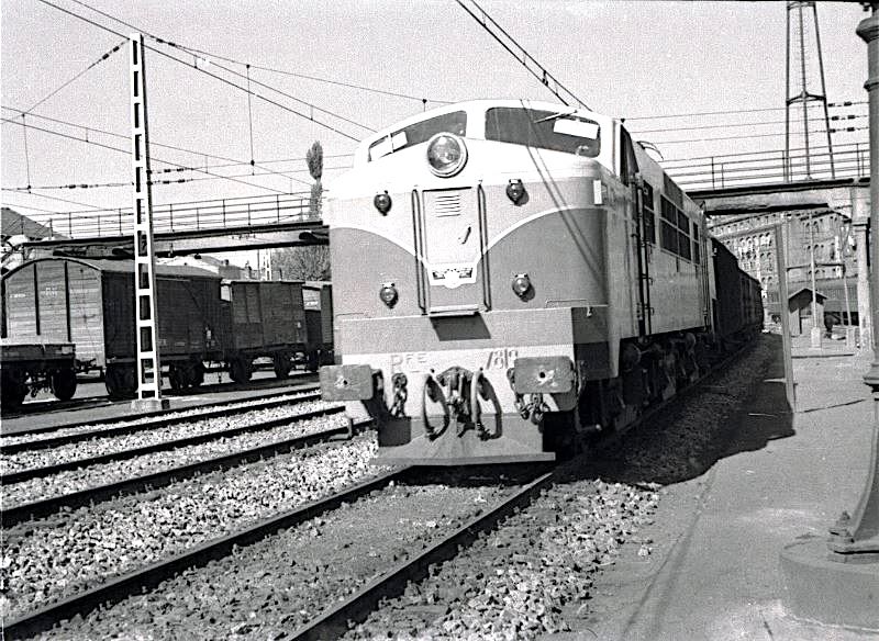RENFE recibió las veinte unidades de una primera serie entre 1954 y 1955, de una forma bastante paralela a las diesel ALCo 1600, de las que ya he tratado en una entrada anterior, y que fueron numeradas como 7801 a 7820. Su librea original estaba constituida por dos tonos de verde y otro color marfil. En esta interesante filmación de NO-DO del año 1955 pueden verse algunas imágenes de la fabricación de estas locomotoras en Sestao y de sus primeros servicios.
