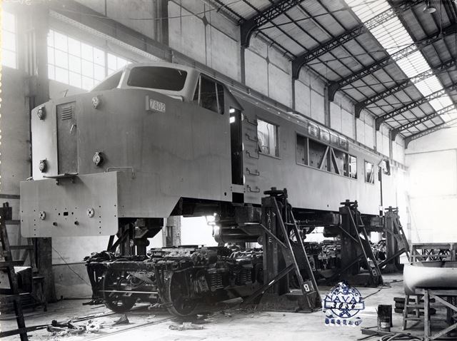 | La 7802 en la fábrica de la SECN en Sestao con su caja preparada para instalar sobre los bogies (Archivo Histórico Ferroviario del Museo del Ferrocarril de Madrid (AHF/MFM. Foto: SECN) |