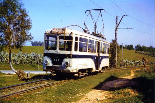 Coche 177 de los Tranvías de Sevilla fotografiado el 13 de abril de 1964 en las proximidades de Puebla del Río. Fotografía de Jeremy Wiseman