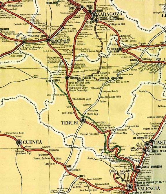 | El trayecto ferroviario entre Sagunto a Teruel, Calatayud y Zaragoza (desvío en Caminreal) en el mapa de Benjamín Forcano de 1948 |