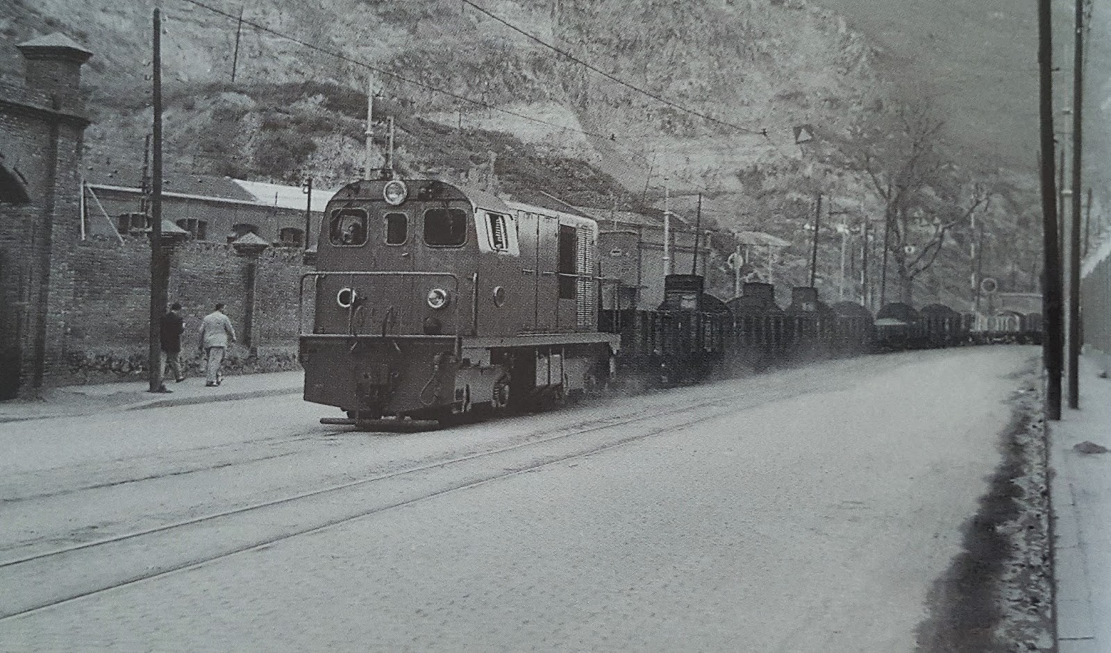 | En octubre de 1959 Jeremy Wiseman fotografió a una de las tres Alsthom en cabeza de un tren de mercancías dirigiéndose desde el puerto hacia el interior |