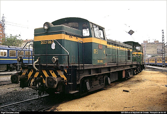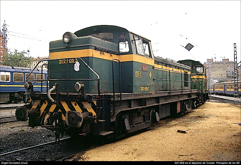 Conocí a un único ejemplar de la serie casi por los pelos. En agosto de 1992, dando vueltas por la estación de Oviedo, vi estacionada a una locomotora diésel desconocida para mí. Me acerqué y vi que era la 307-008 y, por supuesto, la fotografié de inmediato. Me gustó su estética, quizás algo más airosa que otras locomotoras de su tipo, pero poco más sabía entonces de ella.