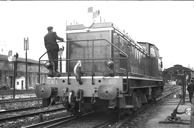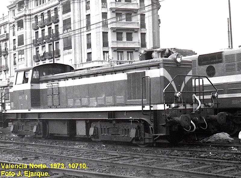 | La todavía 10710 en Valencia-Norte en 1973, todavía sin barandillas laterales (Foto: J. Ejarque) |