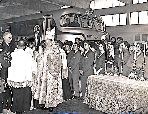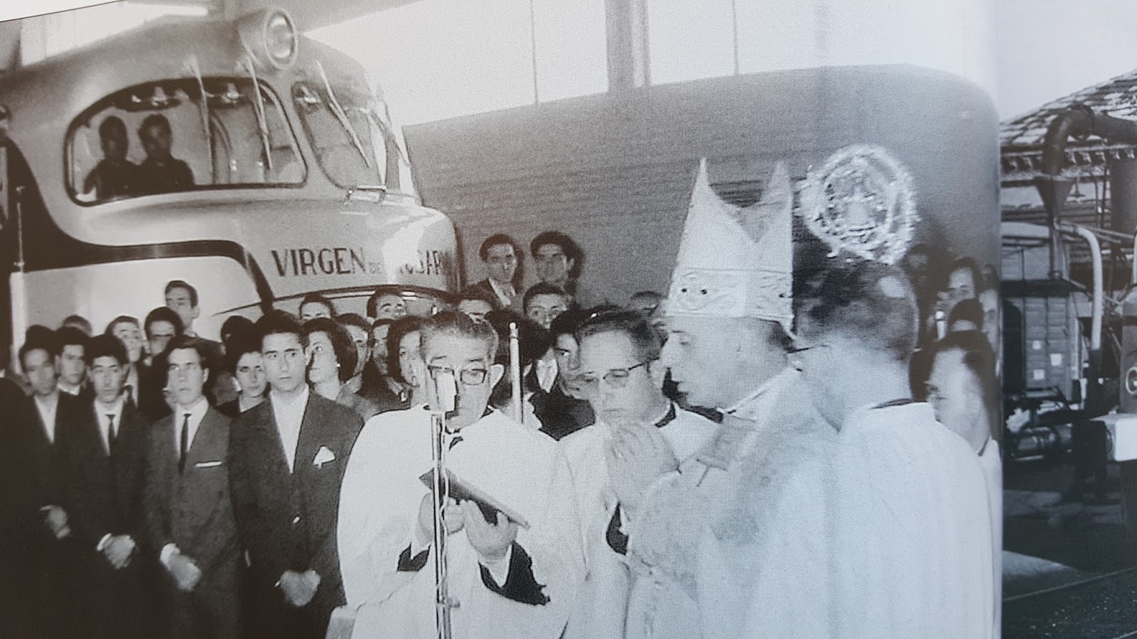 | Bendición de la 2001T Virgen del Rosario en los talleres de Aravaca. Al fondo, el prototipo del Talgo III, denominado Estibaliz (Foto: Patentes Talgo) |