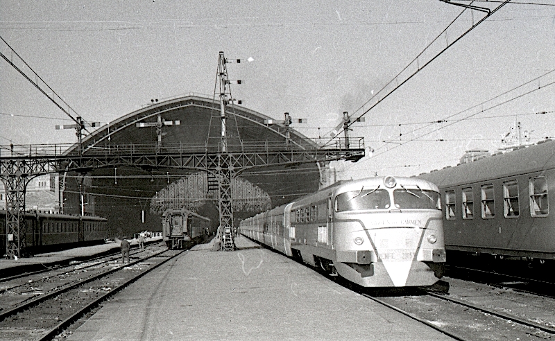 | Típico ambiente en la Madrid-Chamartín de mediados-finales de los 70. En primer término la 2009T "Virgen de Gracia" encabezando probablemente un servicio al País Vasco. En segundo plano, una de las últimas unidades TAF en servicio encargada de la relación Madrid-Burgos. Al fondo, un TER (Foto: Ángel Rivera) |