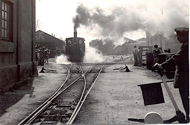 | Curiosa imagen del día inaugural que nos permite conocer la disposición original de los pequeños coches de dos ejes (Foto: Arxiu Municipal de Sant Feliu) |
