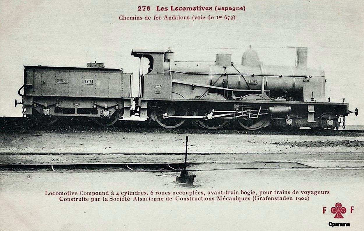 Como vimos en una entrada anterior, en 1901 la compañía MZA puso en funcionamiento sus primeras locomotoras del tipo 2-3-0 de doble expansión. Sólo dos años después, en 1903, la Compañía de Andaluces también empezó a operar con locomotoras de este tipo pudiendo así economizar gastos y, por supuesto, mejorar sus servicios tanto en rapidez como sobre todo en comodidad al poder utilizar coches de bogies.