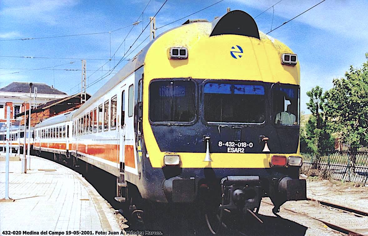| El 432-018 en Medina del Campo el 19 de mayo de 2001. Al parecer estaba a la espera de pasar por talleres (foto e información: J. A. Méndez Marcos) |