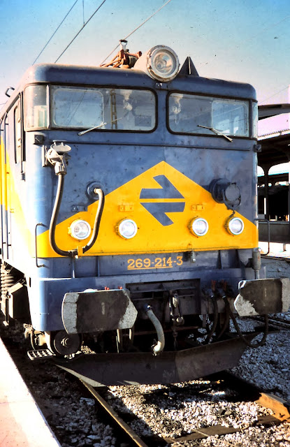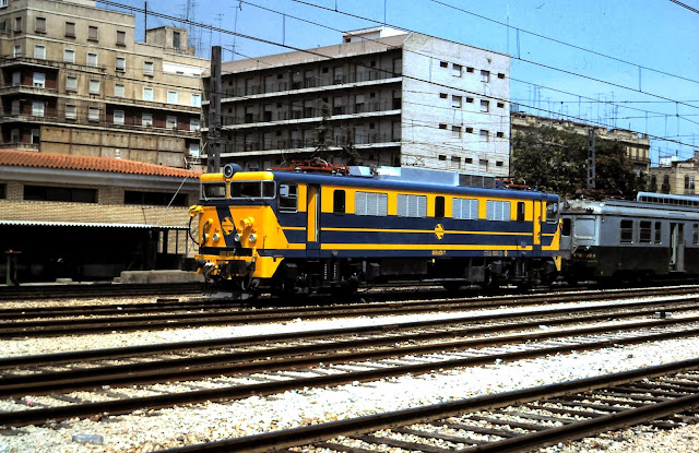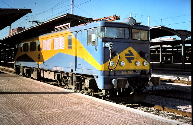 De agosto del 83 es la primera foto que conservo de esta segunda subserie de las 269-200. Se trata concretamente de la 231, y está tomada en la estación de Valencia. Debía estar recién estrenada puesto que fue entregada a RENFE por CAF ese mismo año y quizás estuviera asignada a Can Tunis o a Fuencarral. Muestra ya el nuevo esquema de pintura, también en azul y amarillo, denominado "mil rayas", muy distinto a las "Mazinger".