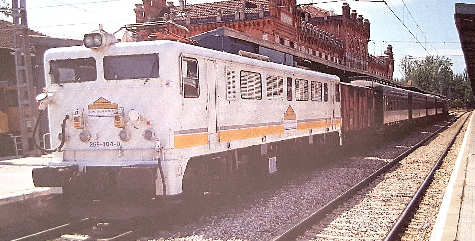 | La 269-404, también llamada "vaticana" por logo y colores estuvo durante un tiempo dedicada a la tracción del Tren de la Fresa. Aranjuez, mayo 2010 (foto: I. Martín Yunta) |