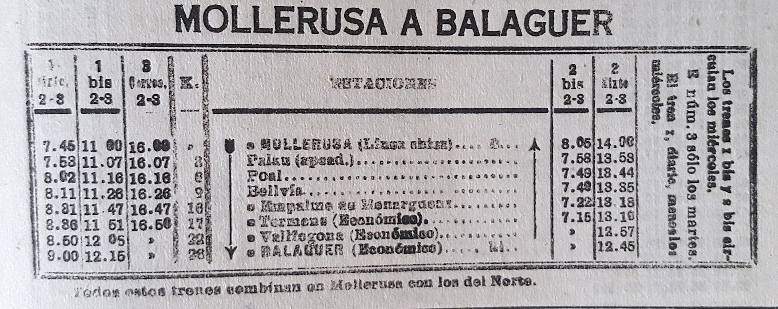 | Horarios de diciembre de 1939. Como puede verse todavía no circulaban trenes entre Térmens y Balaguer |
