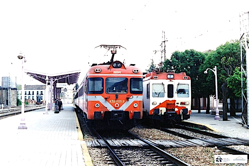| En mayo de 1990 coincidían en la estación de El Escorial un electrotren 432 y una 440 con una curiosa -y probablemente inacabada- pintura frontal (AHF/MFM. Autor: Justo Arenillas) |